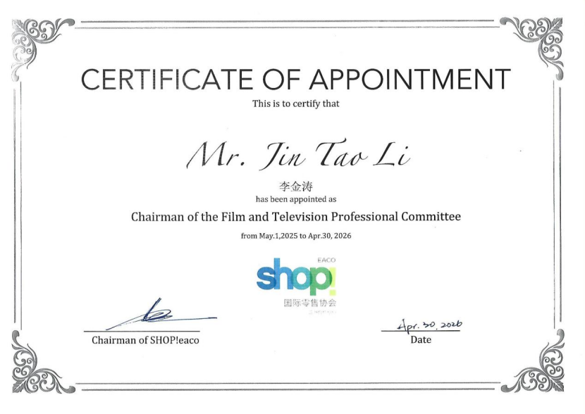 李金涛先生凭借其在中国影视广告行业的威望素著和影响力,以及杰出成就和突出贡献,特被Shop!国际零售协会任命为影视专业委员会主席,近日由Shop!国际零售协会亚洲合作组织数字化营销奖评选执委主席/中国广告网董事长-毕玉强先生为其颁发了荣誉委任状。